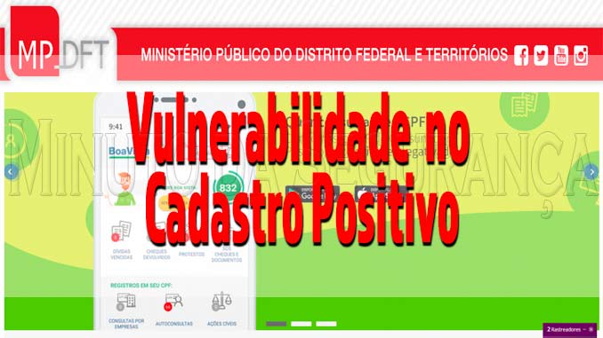 MPDFT abre investigação sobre possível vulnerabilidade no Cadastro Positivo. A Unidade Especial de Proteção de Dados e Inteligência Artificial (Espec) do Ministério Público do Distrito Federal e Territórios (MPDFT) instaurou nesta segunda-feira, 13 de janeiro 2020, Inquérito Civil Público (ICP) para investigar possível vulnerabilidade exposta no site sobre o Cadastro Positivo. O termo vulnerabilidade exposta é utilizado quando há a possibilidade de obtenção de informações sensíveis por agentes mal intencionados.